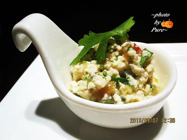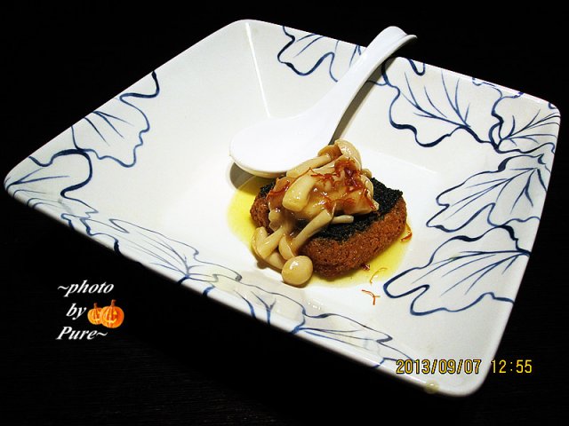 【脆贝松菇碧绿豆腐】更加精致的豆腐。表面有焦香而不显焦。切开里面是羊脂白玉般晶莹剔透的内在。豆腐上面同样用的是迷你菌菇。还带着脆贝,不仔细看还没有发现。吃在嘴里脆脆的口感才让人发现不一般啊。豆腐味浓郁。