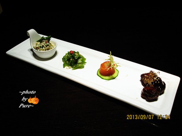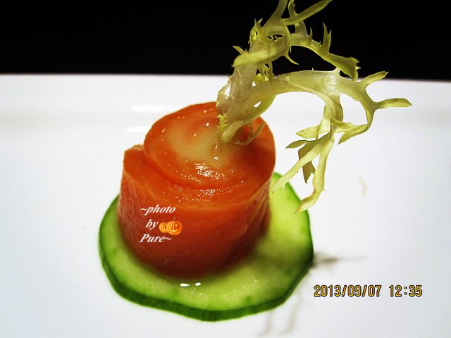 【锦庐四品】糖醋小排、龙豆、烟熏三文鱼卷和皮蛋豆腐。上来的时候精致到了极致。扑鼻而来的香醋味让我忍不住先尝了糖醋小排,里面夹有脆骨。肉质鲜美酸甜。地道的本帮上海菜。龙豆微辣。绿色的龙豆上画龙点睛般地点缀着红色的辣椒粒。一咬爽口鲜辣。烟熏三文鱼是亮点。里面包裹的wasabi冲得恰到好处。似乎眼泪在眼眶里,不爱芥末的我也突然喜欢上了它。皮蛋豆腐放在弯柄勺子里。豆腐也可以那么美貌