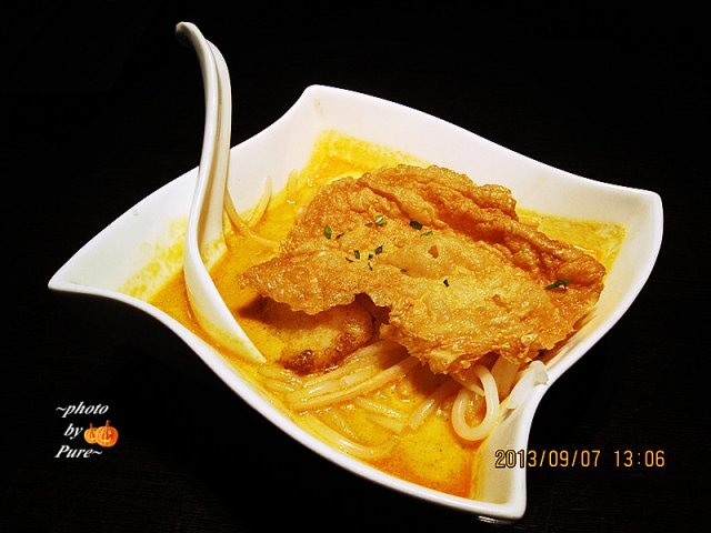 【新加坡拉沙】好地道的叻沙。不比我在新加坡吃的差。摆盘比起这款在新加坡的平民美食来说精致得多了。波浪花纹的碗边,里面食材丰富,鹌鹑蛋,鱼饼,脆豆腐衣,绿豆芽。叻沙软糯却很有嚼劲。爽辣的滋味让我额头冒出了汗