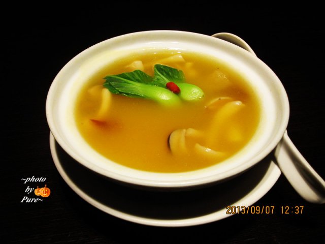 【极品菌菇汤】浓稠的汤汁鲜美无比,勺子一舀上来的都是迷你的菌菇和竹荪等小资的食材。里面的料还很丰富。碧绿的小青菜,金色的汤汁。诱人而又美貌。煨汤可以做得这般鲜美算是用心的了。