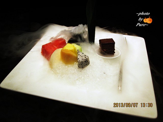 【锦庐甜品】等了一会呢。上来的时候烟雾缭绕,如至仙境。中餐吃到此般便是极致。各种水果切片,却是刺身的待遇,晶莹剔透的冰屑在迷幻的烟雾里愈发美貌。见方的立体巧克力蛋糕口感类似21cake的巧克力慕斯。