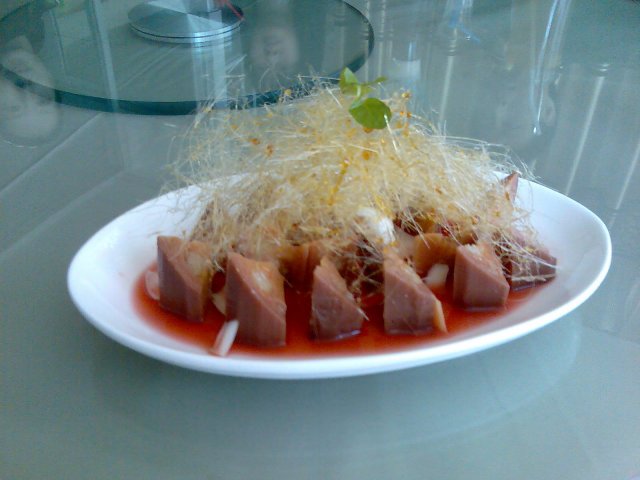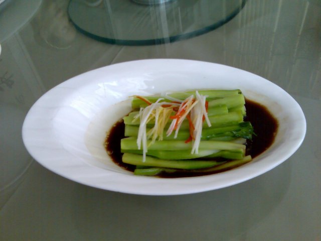 “秋风起,鲑鱼肥”,鲑鱼之名早已如雷贯耳,今天才有幸识荆。逸栈的堂灼鲑鱼很值得推荐,用很精致的小碗端上来,每人一份,鲑鱼的确是极嫩极鲜,有种入口即化的感觉。汤里似乎还有种菌香,应该很养生吧。