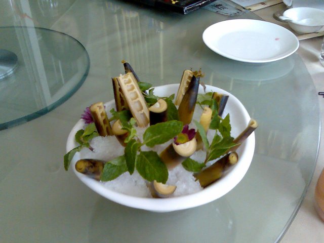 手剥笋看起来有点少,冰上插着十几根,但作为饭前凉菜似乎也不宜太多,润润口就可以了。笋很鲜很嫩,我这个来自南方竹乡的也很认同。