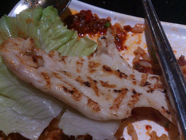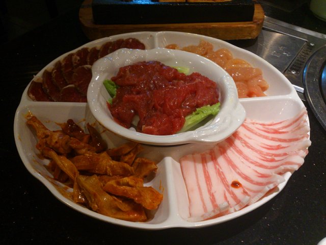 烤肉拼盘,印象中只有牛肉味道尚可。两人吃不完