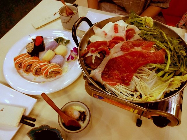 【高级牛肉寿喜锅】98元,就是日式牛肉火锅,汤还算比较鲜,里面有肥牛,大白菜,蘑菇,大葱等,肉比较少,一般吧。