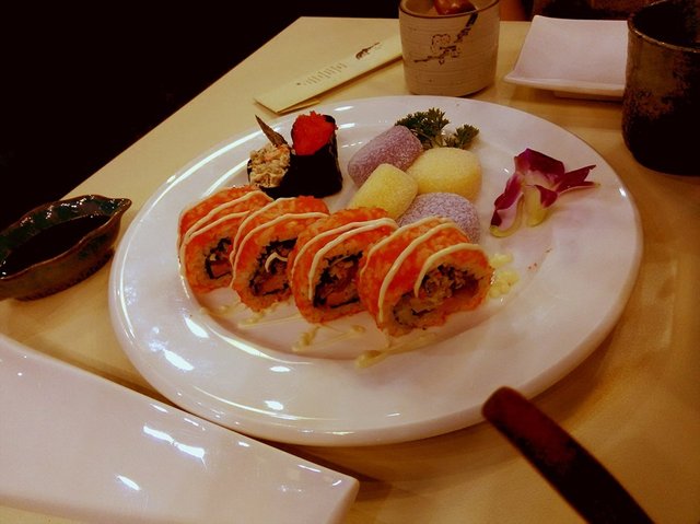 【方与圆经典寿司拼盘】98元,这个有点像韩国的加州卷和小年糕,就是寿司,外面还有一层鱼籽,味道还可以,小年糕倒是比我想象的好吃很多,里面像是奶油还不腻,挺不错。