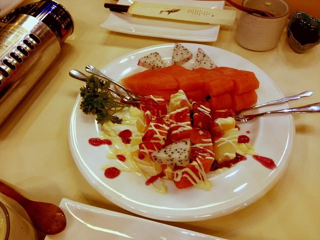 【水果沙拉】造型好看,色彩丰富,还很贴心的送了四个叉子,有西瓜,草莓,火龙果还有罐头,沙拉酱很厚,比较好吃。