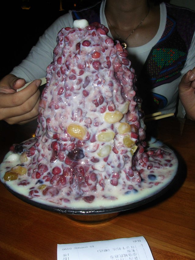 【红豆牛奶冰】很大一份,冰堆的很高,红豆的量给的也很足,下面也有不少的炼乳。非常解辣的东西,如果吃香锅的时候给上来就更好了