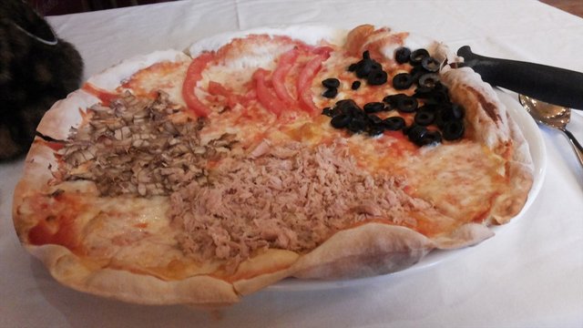 面包啃完了,我又等了至少20分钟,终于迎来了我的披萨。事实证明我的披萨选错了,为了可以多尝试几种口味所以点了四味披萨。已经忘记是哪四味了,食材白痴伤不起