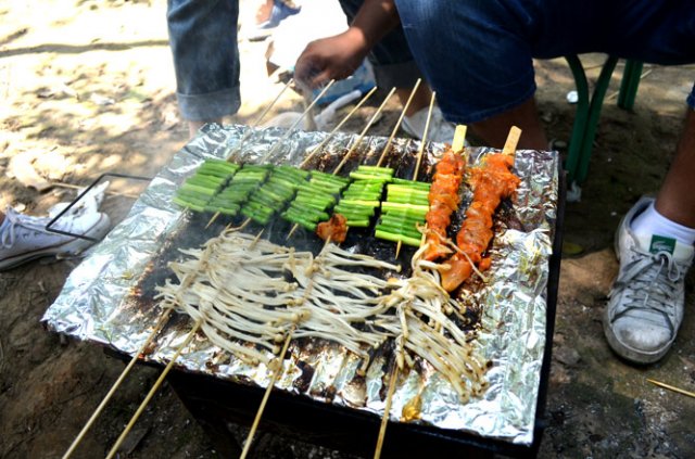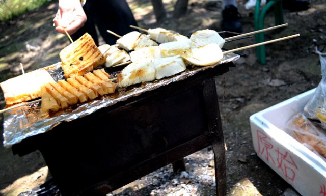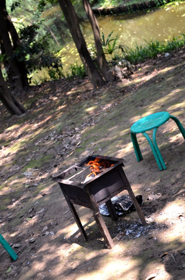 老远就闻到了烧烤区的飘香。在门口借了炉子和凳子,沿河的地方找了块空地,然后生火,这火可真不好生,基本是男生包着干了。我偶尔帮忙找些细的干树枝之类,这样可以助燃。好不容易,火旺了,于是架上铁架、铺上锡纸,烧烤DIY就这么开始了。