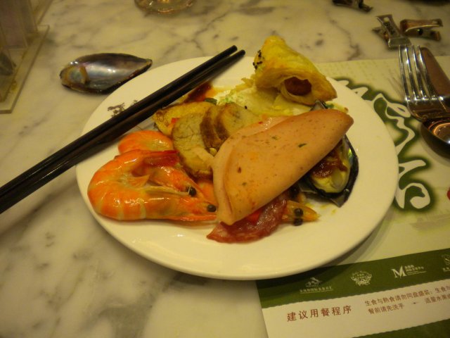 然后进入主食,虾饺、叉烧肉、培根、天妇罗……生蚝和天妇罗很近,所以在这个环节才海量吃……红肉配红酒。虾饺可以给满分,居然一个里面有三只虾,太满意了,别的点心和虾饺差的档次也太多了些。叉烧也可以给满分,这个属于不过不失。培根和其他的德国香肠以及熏肉类都可以给满分,材料和之前在五星饭店的早餐差不多,但是一般加一道烹饪。但是天妇罗要扣一分,虽然已经趁热吃了,但是有炸过头的部分,每只天妇罗上都有那么一点点味道不对的地方,而且也没有找到酱啊。