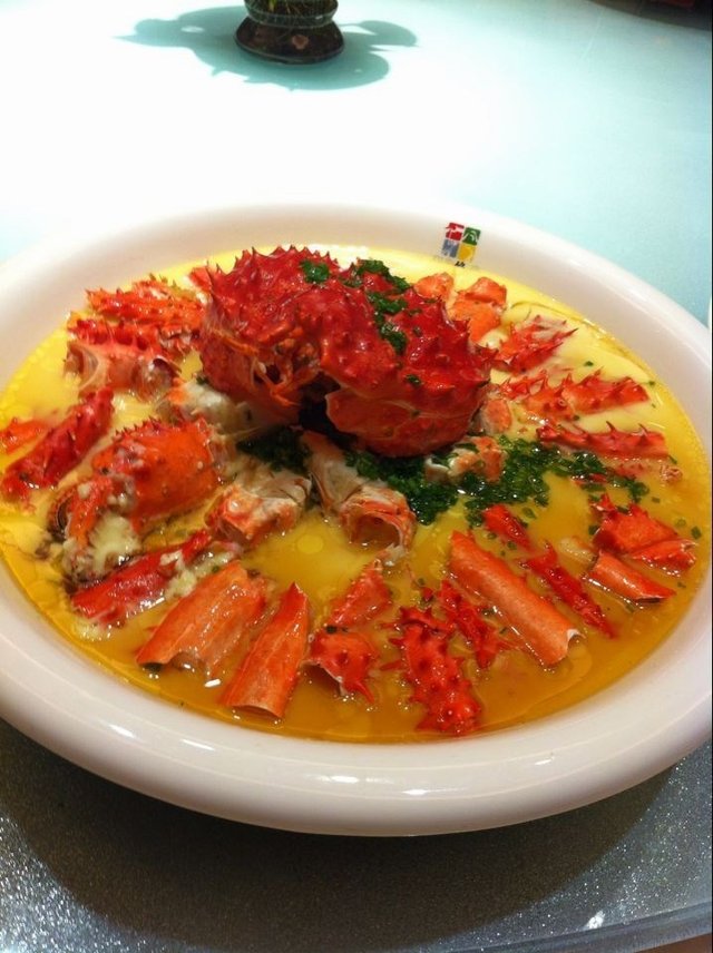 【阿拉斯加帝王蟹】:这道菜也是蛮别致的,帝王蟹蒸蛋里加入了黄酒的元素,靠自身蟹的鲜美,加上黄酒的香甜,共同创造了甜鲜的口味,蛋吸收了鲜甜的美味,入口顺滑,蟹肉肉质鲜美很有嚼劲