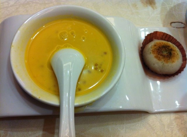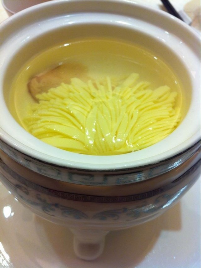 【松茸菊花盅】:造型非常的好看,菊花的造型搭配松茸,非常干净清爽的一道汤,菊花刀工非常的好,入口嫩滑,松茸的香气一条直线似的,香道肚里,那种鲜美无与伦比了!