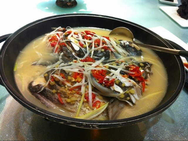 【千岛湖野生鱼头】:这道鱼头一上来,好大一锅,鱼头真心的大,里面的配料非常的多,搭配了藕,还有剁椒,融合了这么一锅原汁原味的鲜美汤底,鱼肉非常的嫩滑,藕已经炖的很酥烂了,藕断丝连的感觉非常的细腻,赞