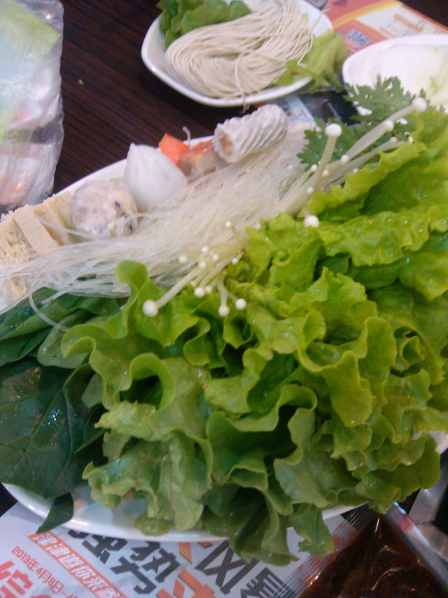 蔬菜拼盘很大一份,里面是菠菜,大白菜,生菜,粉丝,萝卜,豆腐,金针菇,各种肉丸等在一起拼的。青菜都很新鲜,就是白菜太大颗了,需要用手撕开才行,白菜都是叶子多的那种白菜,吃着清香略带着蔬菜特有的甜味,煮的约久越容易入味。各种肉丸吃着很有弹性,粉丝很容易熟,基本下锅稍煮一下就可以了,金针菇煮出来也非常好吃,很韧,味道清香。