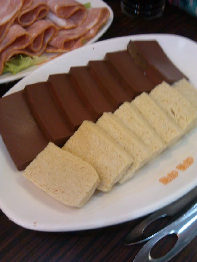 冻豆腐和鸭血也可以拼一盘,冻豆腐一般,煮久了就烂了,捞不出来,鸭血煮的越久越好吃,吃着鲜嫩可口,带着本身特有的味道,很香,每次去都必点的一道菜。