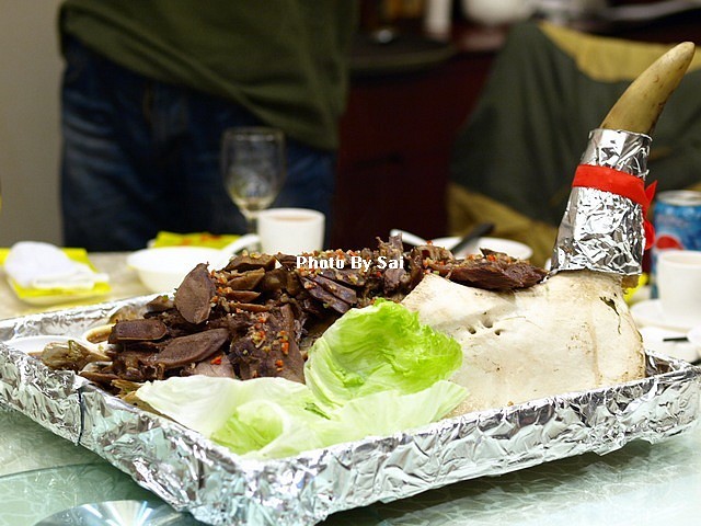 至尊牛头,因为坐在比较靠里边就听到靠门的tx惊呼“好大,好牛”,服务员端上桌的时候是被震撼了一下,牛头骨很完整还有带一根牛角,里面的肉好多啊,到最后都没有分食光,牛肉特别酥嫩,一点不塞牙,配料有5款,蒜泥、辣酱油、海鲜酱、豆豉、鲜酱油,每样都蘸一下就是不同的味道,这个是要预定的,感觉挺超值,sina微博一下。