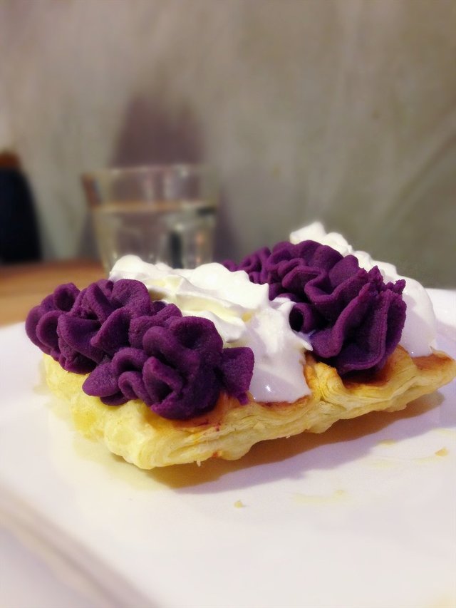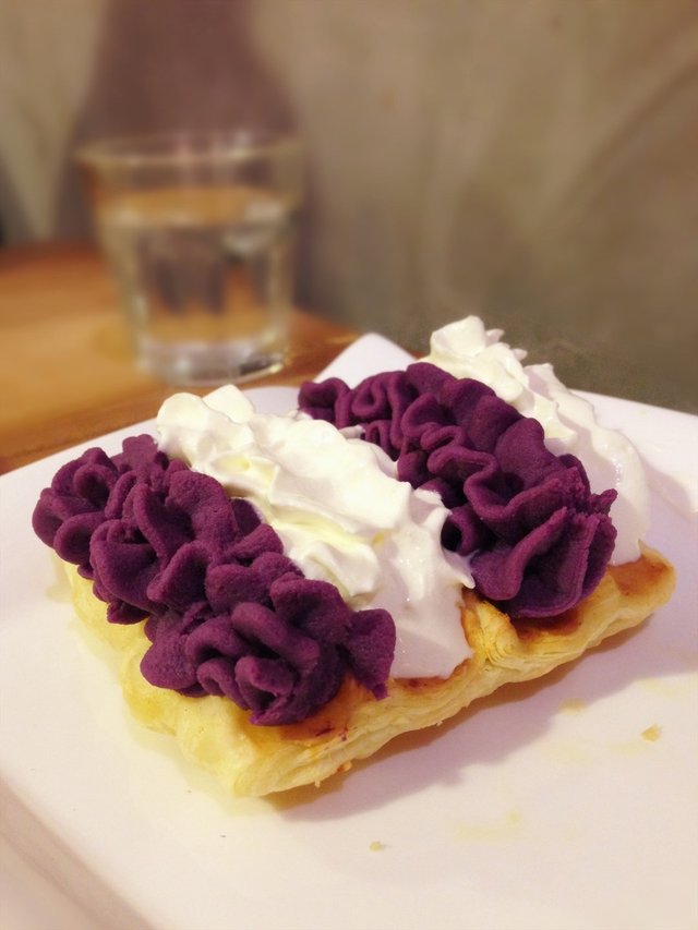 就是一块华夫饼上淋了一层芝士,然后上面挤了两条紫薯泥两条奶油。