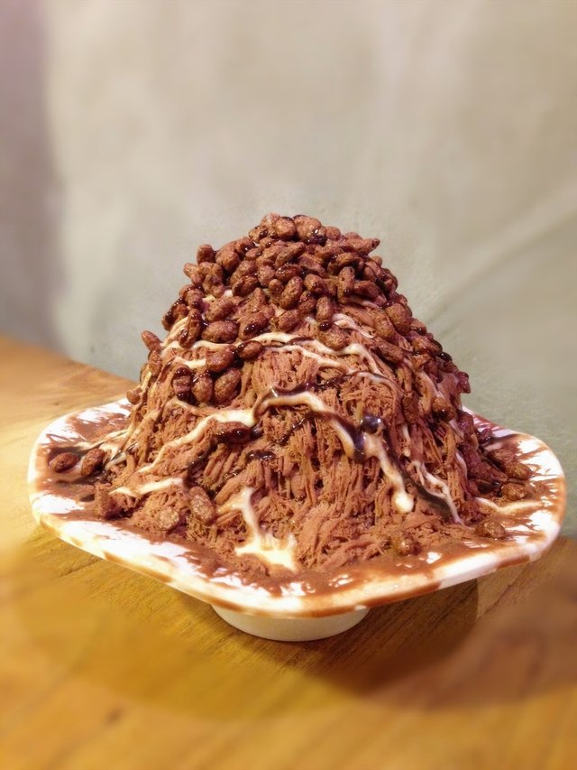 这个巧克力口味的冰是褐色的,巧克力味的。我看芒果绵绵冰是黄色的。