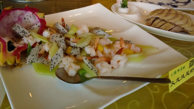 素干切牛肉: 用豆腐皮经过多层的裹制的!几乎以假乱真!重点是全素口味,用酱油等调料卤制的,很给力。 酸辣白菜和杨花萝卜都是清口滴~ 熏鱼是偏甜口味~海蜇头也比较清淡~ 热菜系列 芙蓉牛肉羹,非常的清爽,里面的配绿居然是苦瓜,但是一点苦涩的味道都么有。好喝! 火龙凤尾虾,是现在非常流行的水果入菜的做法,虾子处理的非常干净,虾线去掉了。虾子很新鲜,吃起来清淡又弹牙 橙汁鸡柳,口味很像糖醋里脊,颜色更加的鲜艳。 鸡汁烩鱼肚,吃起来很像皮肚呢!据说鱼肚是鱼泡泡,嘿嘿~ 百叶荠菜卷,创新菜,用百叶裹着荠菜,然后切好后烩制。 卷轴双拼,这个菜是参加比赛获得金奖的~摆盘很像孔雀开屏呢!左边的小卷里面裹的是豆腐皮,调制的鱼香口味的汁浇在上头,右边是卷的马兰头,非常时令的菜色。