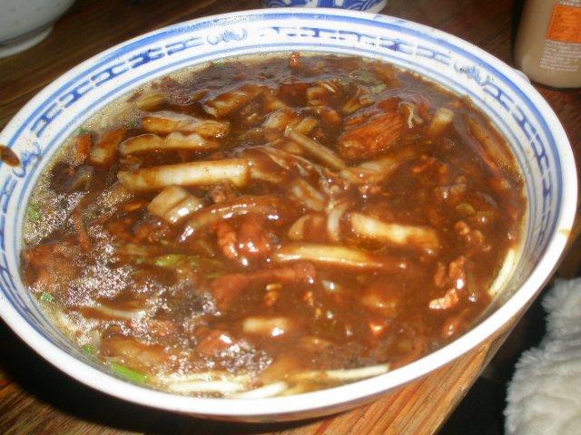 面上了之后,第一感觉,油啊!红彤彤酱油色的一片,色香味里面,色面绝对是过不去了,喝了口汤,过于浓厚了,不爱!面条就是一般性的细面,没什么特别的。浇头里面,牛肉绝对是一败笔,耗油牛肉的做法,但是牛肉明显就是浆过头的感觉,或者更加直接点说可能就是牛肉膏腌过的假牛肉。不灵,说是加素菜,其实就是一点点的大白菜,一点都不好吃!