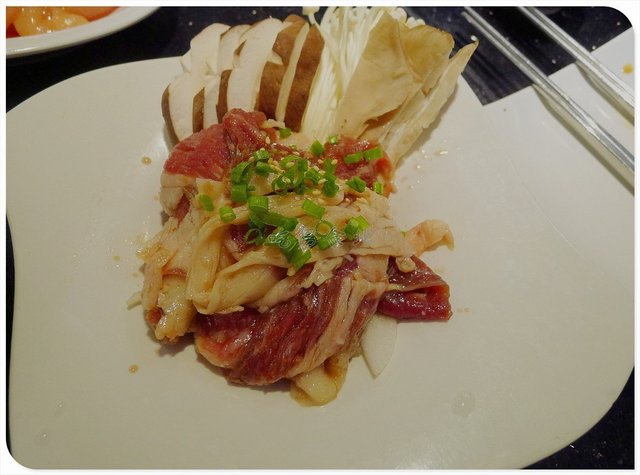 牛五花肉,46元,套餐里面是牛五花,服务员不声不响的就给换成了羊五花,真够自觉的,说一声就那么难么?羊肉味很浓,太容易就吃出来了。