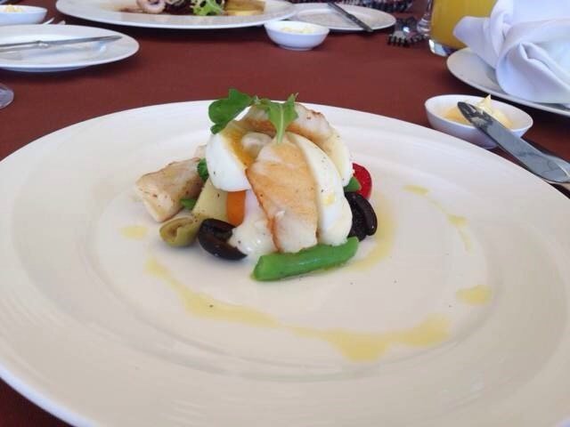 前菜我要的是某色拉配银鳕鱼。很精致的摆盘,个人觉得其实作为前菜,量是很够的,但是因为盘子太大,得中间那一小坨特别迷你,银鳕鱼有6-7块,熟透而不老,其他配的有几截芦笋,胡萝卜和橄榄,因为酱汁比较均匀,我基本都吃掉了。