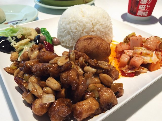 宫保鸡丁套餐,24米。想点茄子饭还没有了,阴差阳错点了这款,没想到味道出奇的OK。米饭软硬适中,长米粒看起来就有食欲有木有。泡菜用的胡萝卜、白萝卜和洋白菜腌渍,酸甜爽口。一颗虎皮蛋切开,增加了营养。宫保鸡丁完全不是食堂配菜的感觉,就是把小炒放上去了,鸡肉和葱、花生炒制,甜辣口味特别有爱,正宗川味儿啊。鸡丁和米饭配着麻椒口味的小凉菜,再加上特色的四川泡菜,味道一级棒。