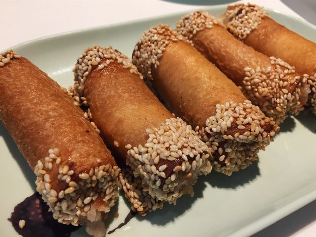 芝麻香芋卷,10米。看是推荐点的,稍有点失望了。炸制的非常酥脆,香芋馅儿用的真材实料,但正因为用的是芋头,颜色淡淡的,味道比较清香,感觉没有那种紫色夹心的香芋卷更有滋味。原来超市有卖速冻的来着,现在很难寻觅到了。