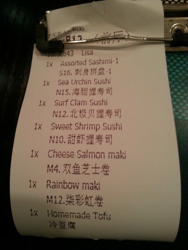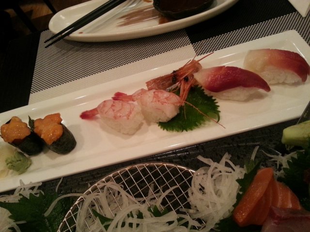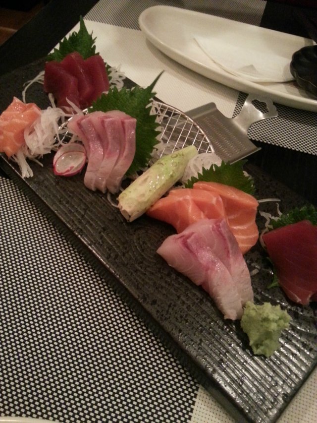 他们家刺身拼盘有3种,按价格从高到低的,我们选了第二档的,106元的,当然还有100不到的和200左右的,里面有三文鱼,金枪鱼,白鱼三种,切得很厚,各五片,而且每一块均等大小,一口下去很爽啊,而且他们家的芥末是可以自己弄的,用山葵自己磨,不会很冲~刺身很新鲜,肥美~