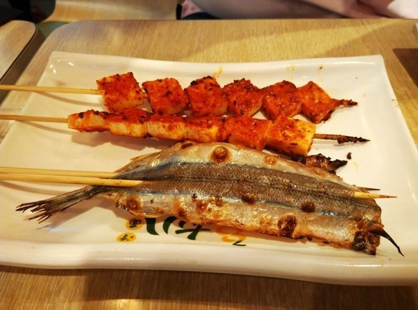 烤明太鱼,4.5元,头尾有点烤焦了,硬硬的,味道我觉得也一般~牛板筋,2.5元/串,这个我完全咬不烂呀,我的牙也的确不太好,呵呵,浪费掉了~