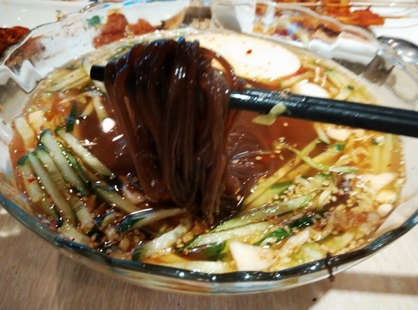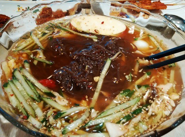 最喜欢的还是他家的招牌冷面,很大的一碗~ 除了筋斗滑爽的面条之外,还有两大片牛肉和两个小肉丸,还搭配了黄瓜丝、鸡蛋丝、鹌鹑蛋和苹果片,味道非常不错~ 汤是凉丝丝的,酸甜的味道,喝上一大口很有沁入心脾的舒爽啊!