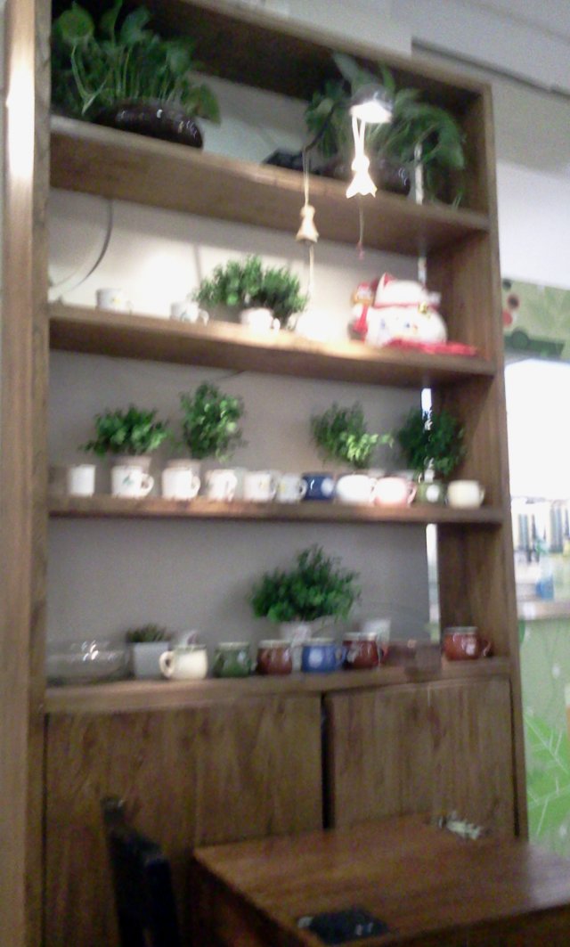 边品着甜食,边看着四周的摆设,我们坐的沙发的斜对面是一排架子~上面摆满了各种各样的可爱小杯子、绿色植物还有风铃和招财猫~很有趣