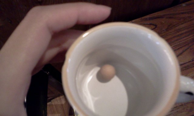 不知道大家有没有走过去把小杯子拿下来看看~其实我当时纯属无聊,觉得小杯子挺可爱就跑过去拿下来一一的看,结果发现很有趣的东西~这个杯子里居然有一个豆子?不知道到底是什么,其他的杯子我也看了几个,每个里面都有一个一毛钱硬币~好有趣,不知道有什么用意