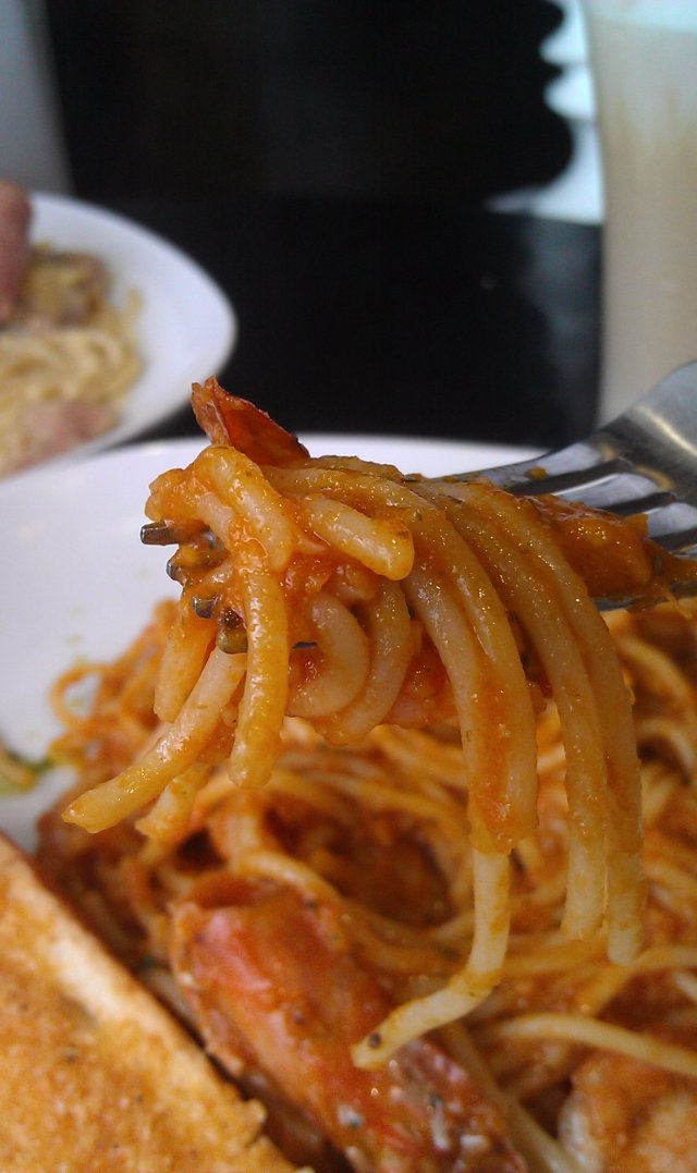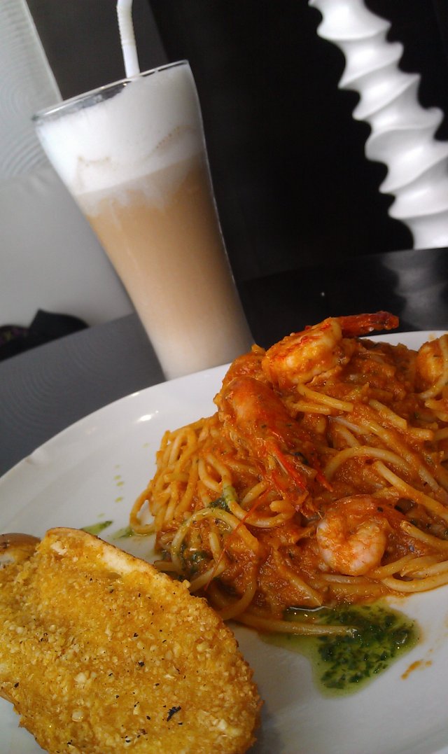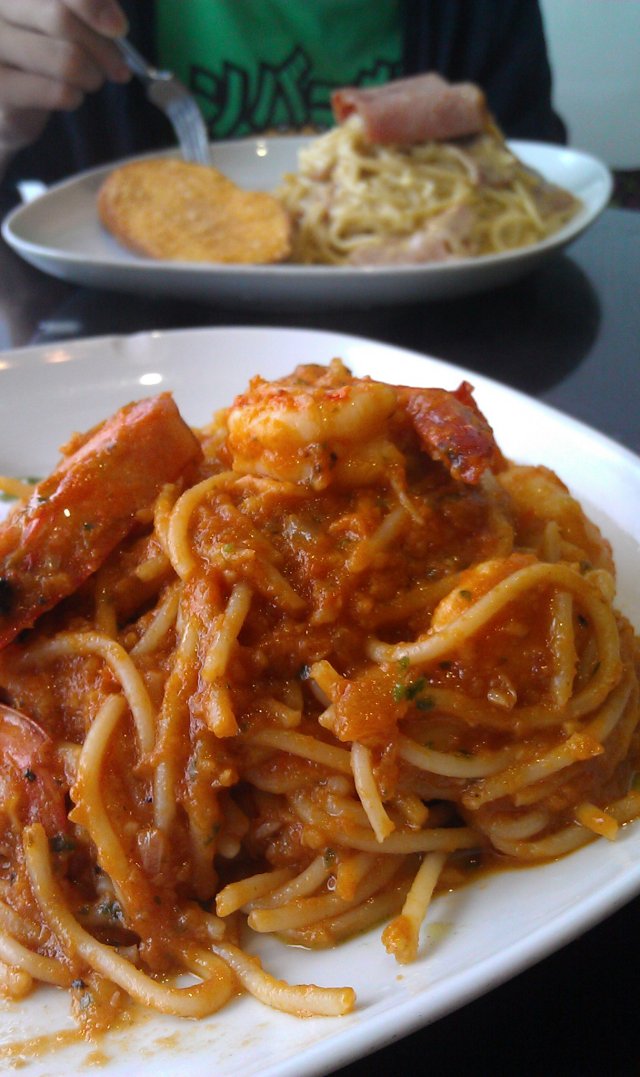 来他家主要试试意粉:香草海鲜意粉,卖相一般啦,不过味道不错,意粉煮的刚好,不软不硬,海鲜还算新鲜,有虾有鳕鱼片还有鱿鱼。因为用的是番茄酱,倒不会腻味;