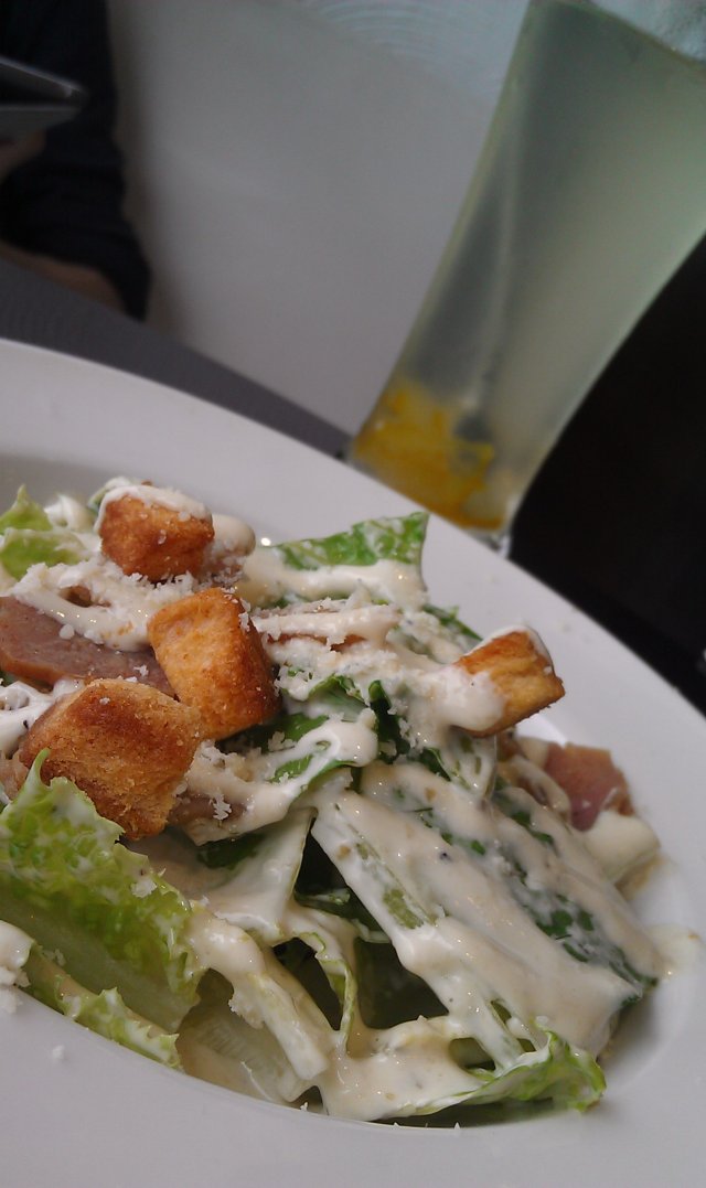 凯撒沙拉在网上被很多人弹,男人却很是喜欢,沙拉酱料和其他地方不一样:特别浓稠,偏咸,而且沙拉拌得均匀,每一片都很入味。