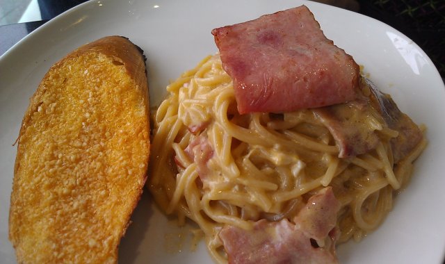 男人爱烟肉蛋意粉,所以放弃点野菌忌廉意粉。烟肉很大片,一开始还以为只有这一点,才发现意粉下面混合了很多烟肉条。奶香味道浓,前几口很惊艳,但使用白汁,怎会不腻?每份意粉旁都配有蒜香片,和其他地方的不一样,他是货真价实的有很多蒜蓉铺面,外脆内软,虽然网评很多人不爱,但我个人还是很喜欢的,也许到我这个时候去吃刚好店主有改良吧,并无太多辛辣味道,而且觉得与众不同,值得关注。