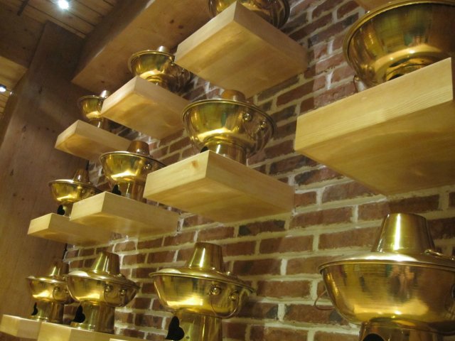 一进门就看见墙上慢慢的全是铜火锅。很漂亮。也很有气派