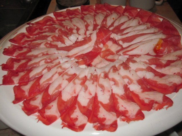 羔羊肉 不是一般的羊肉,而是羔羊肉。肥瘦相间,肉质比较细嫩。而且很容易熟。放锅里一涮就能吃。羊肉非常鲜嫩。