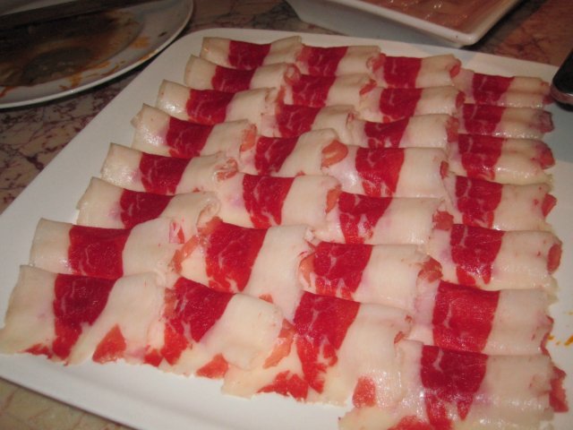 肥牛 一般瘦肉一般肥肉。片切的挺薄的。摆盘很漂亮。也是非常鲜嫩。涮出来肥而不腻口感很好吃。