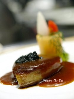 接着上法式红酒鲜鹅肝,60g的鹅肝分量不少,用的是红酒酱,有些鲜甜带酸是苹果的缘故,除了没吃到松露,法国的三大名菜在这里享用了2个,不枉此行,呵呵~鹅肝入口即化,能做成鹅肝的都是鹅的脂肪肝的,所以很肥美~旁边搭配的水果有猕猴桃等,蛮甜的,也可以清清口~