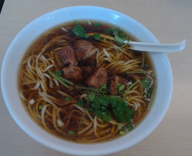 这家的牛肉面虽然价格贵,但是味道还真不错,尤其是里面的牛肉,以前在别家吃的,牛肉都是干牛肉片,没什么味道,这里面放的是牛肉块,做得味道特别好,而且放得量也挺多的。牛肉面的分量也很大,看到都吓一跳,不过最后还是吃完了,味道好嘛。