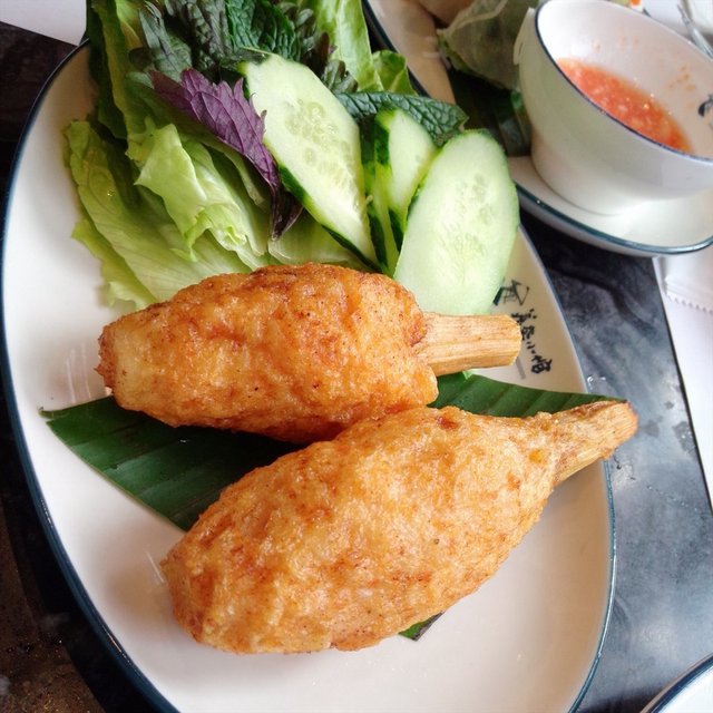 西贡甘蔗虾 38元/份 中间那根东西是甘蔗 小小根好可爱 有点像在吃烧卖的那种肉 个人不太爱