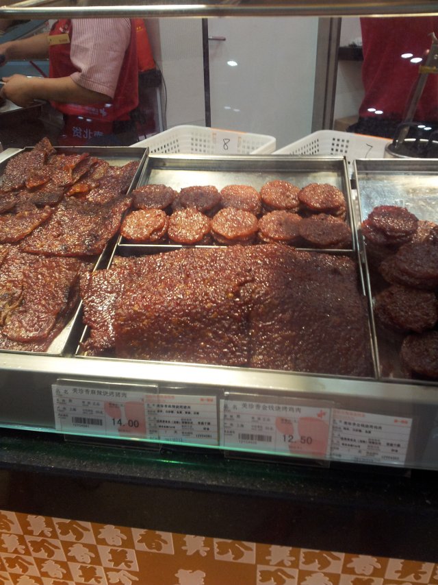 美珍香这家开在热闹的南京东路上的食品一店楼上,这家店近年来在很多热闹的地方都开有店面,这家店店面不大,但是店内环境整洁干净,经常还有店员拿着它家的肉脯给客人免费试吃.它家的肉脯品种很多,有猪肉的,牛肉的和鸡肉的,口味也很丰富,分不辣的和微辣的.个人比较喜欢它家的软猪肉脯,肉脯入口柔软,肥瘦适中,入口嫩嫩的,刚烤好出炉的时候还能吃出汁水,肉脯稍微带一丝甜,味道非常好吃,不过份量比较重,称个几片也就要好几十块了,不过肉脯很香很好吃.