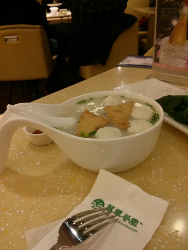 鱼蛋粉很普通的一碗,但是里面的鱼蛋真的好好吃,松松嫩嫩的,绝对不是面粉揉出来的,和香港的味道一模一样,还有他们有特制的蘸鱼丸的料,有点偏辣,我要了两次呵呵