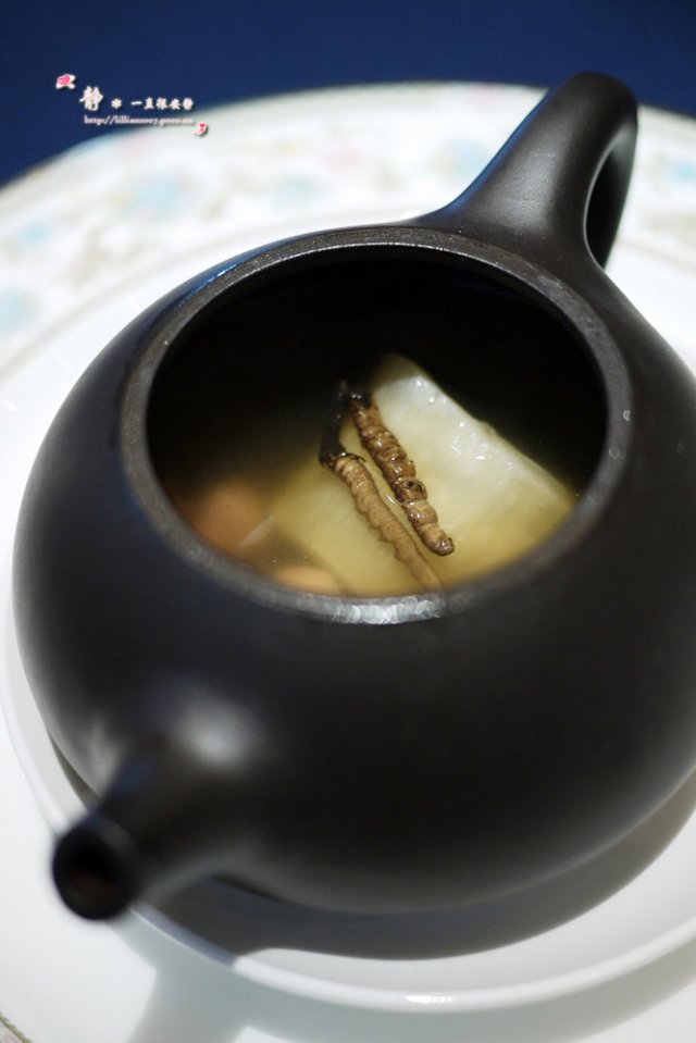 虫草皇花胶养生汤:养生好时节,来碗滋补汤,好好爱自己,嘻嘻。以紫砂壶盛装不仅仅为装盘考虑,实则为了保持汤品的温度,倒入紫砂杯慢慢细口,稍后会有服务员将真材实料的虫草、花胶夹出供品用。汤头的鲜美浓厚不添加味精,绝对是吃得出来的。
