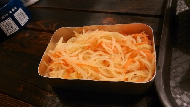 我又另外要了一个土豆丝,也是老饭盒装的,量还可以,拌的样色很好看,土豆丝加胡萝卜丝。这个味道是酸甜口的,很爽口。
