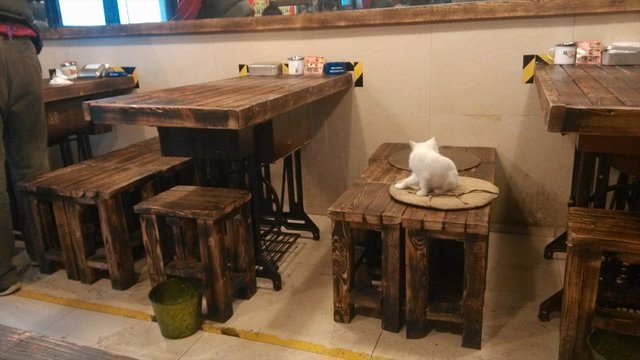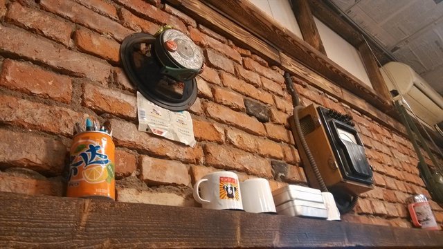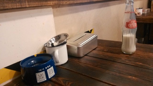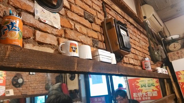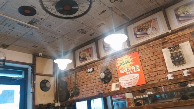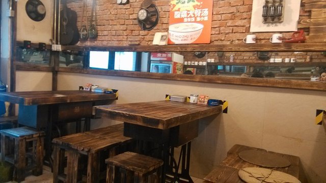 我去的是铁西这家,去那天天气不好,大概1点多到的店了,人不是很多,当时只有一桌吃饭。一进门有6张桌子,地方不是很大,装修风格很有特色,棚顶是报纸糊的,桌子是老式缝纫机改的,房间里挂了很多老式钟表,水壶等以前的物件,非常有特色。
