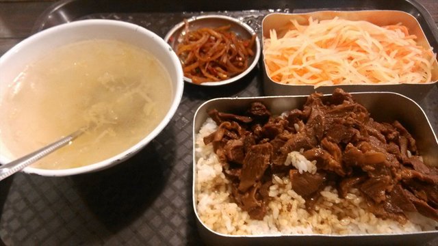 我要的护心肉的,是套餐,老饭盒和餐具装的,有一个盖饭,上面是肉,下面是米饭,肉都是瘦肉,量很多,没吃完都,入味不错,有些汤汁侵入米饭,整体来说很香。一碗酸菜汤,