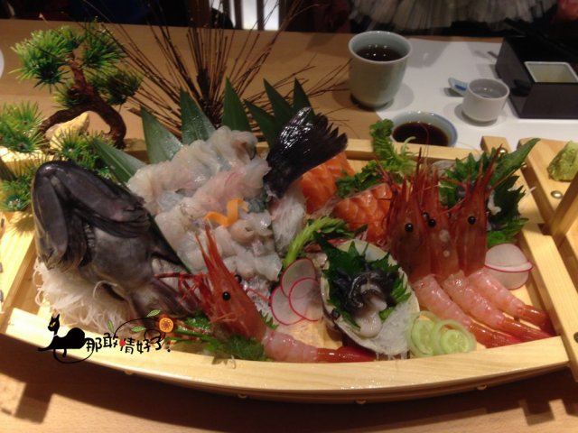 刺身船里的黑色北极贝第一次见,因为这是全鲜的,红色的则是汤过的。那条鱼比较惨,如果不是桌儿上女孩儿多,这鱼上来还能活20分钟,身上的肉都片没了,唉,残忍,我一口没动。虾和三文鱼很美味。